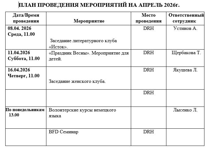 ПЛАН МЕРОПРИЯТИЙ НА АПРЕЛЬ 2026г.
